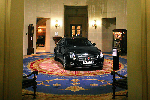 Pedestrians and drivers witnessed an astonishing sight this morning when a car was brought into a London private members club . The extraordinary manoeuvre, using a combination of hydraulically lifting ramps and an electric winch, raised a new Cadillac CTS luxury saloon from the street level on Pall Mall to the height of the Rotunda in the Royal Automobile Club .